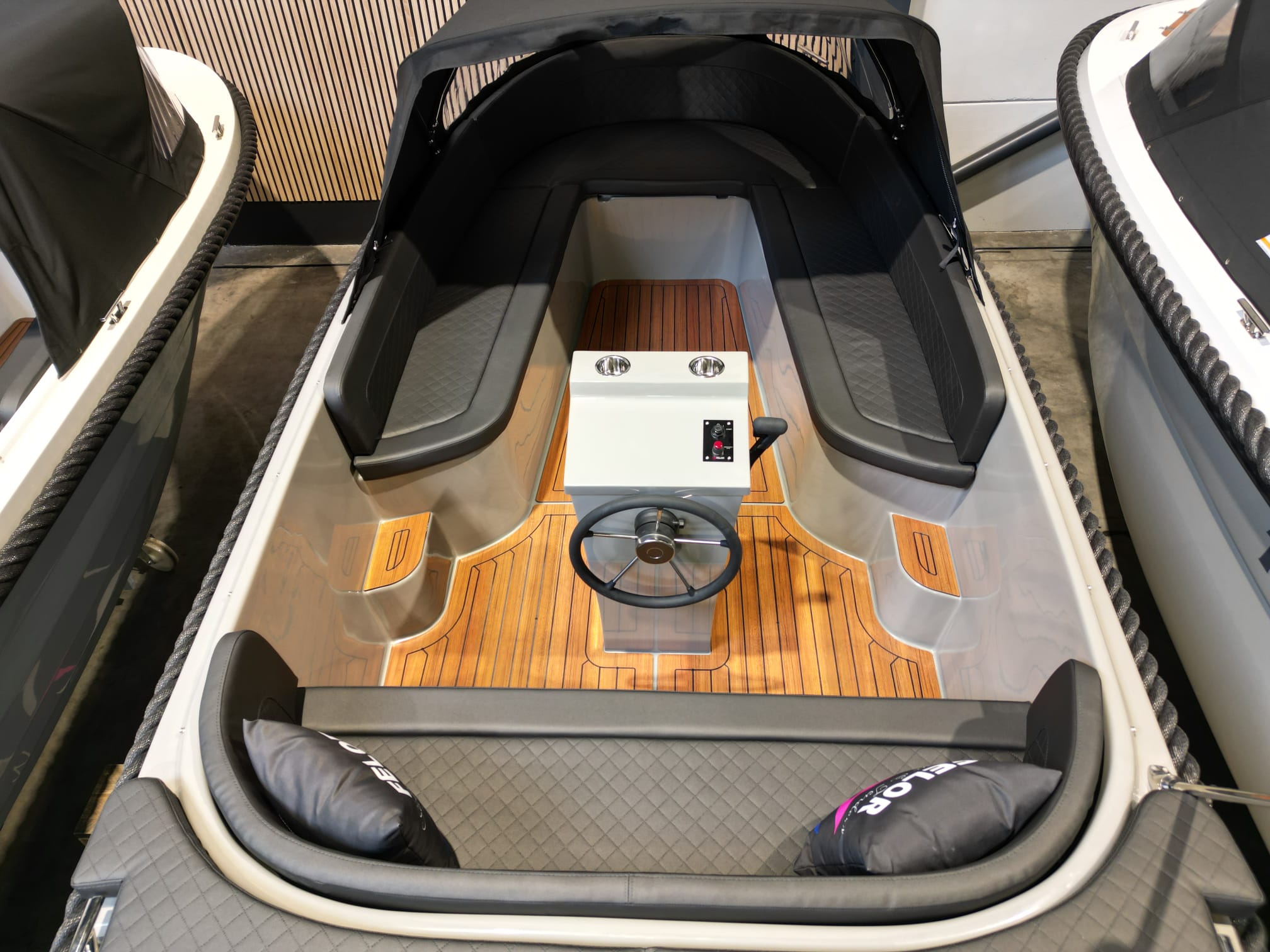 inclusief 15pk Tohatsu elektrisch gestart, buiskap met kuipzeil, luxe zit- en rugkussens met ruit, HPL teakline vloer en zwemplateau, bunkussens, zonnedek, navigatieverlichting, toplicht, stuurconsole met zwart stuurwiel, inbouw hendel, schakelpaneel met USB, zwemtrap, hoofdschakelaar, fenderhaken, kabelaring, RVS kikkers, 12L benzinetank, en accu.